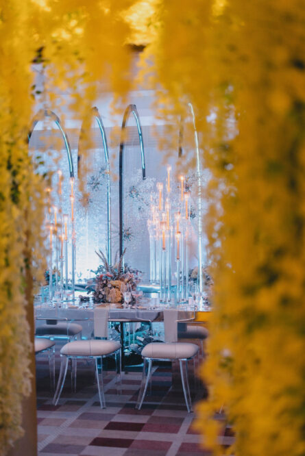 Set in Newport Beach, Inside the Jewel Box invited guests into an immersive dining experience designed to feel like stepping inside a finely crafted piece of jewelry. Crystal-lined walls reflected layers of light throughout the space, while a mirrored hollow-square table anchored the room, creating intimacy and drama. From its center, sculptural arches rose and shimmered, dripping with crystal orbs and modern candelabras. At each place setting, an acrylic menu—echoing the shape of the arches—paired with an acrylic jewel place card, hand-lettered in calligraphy and personalized to each guest’s birthstone. As the evening unfolded, the lighting shifted through a spectrum of hues, transforming the room and bringing every jewel tone to life. Guests entered through a romantic wisteria-draped passage, setting the tone for an evening of refined sparkle and wonder.