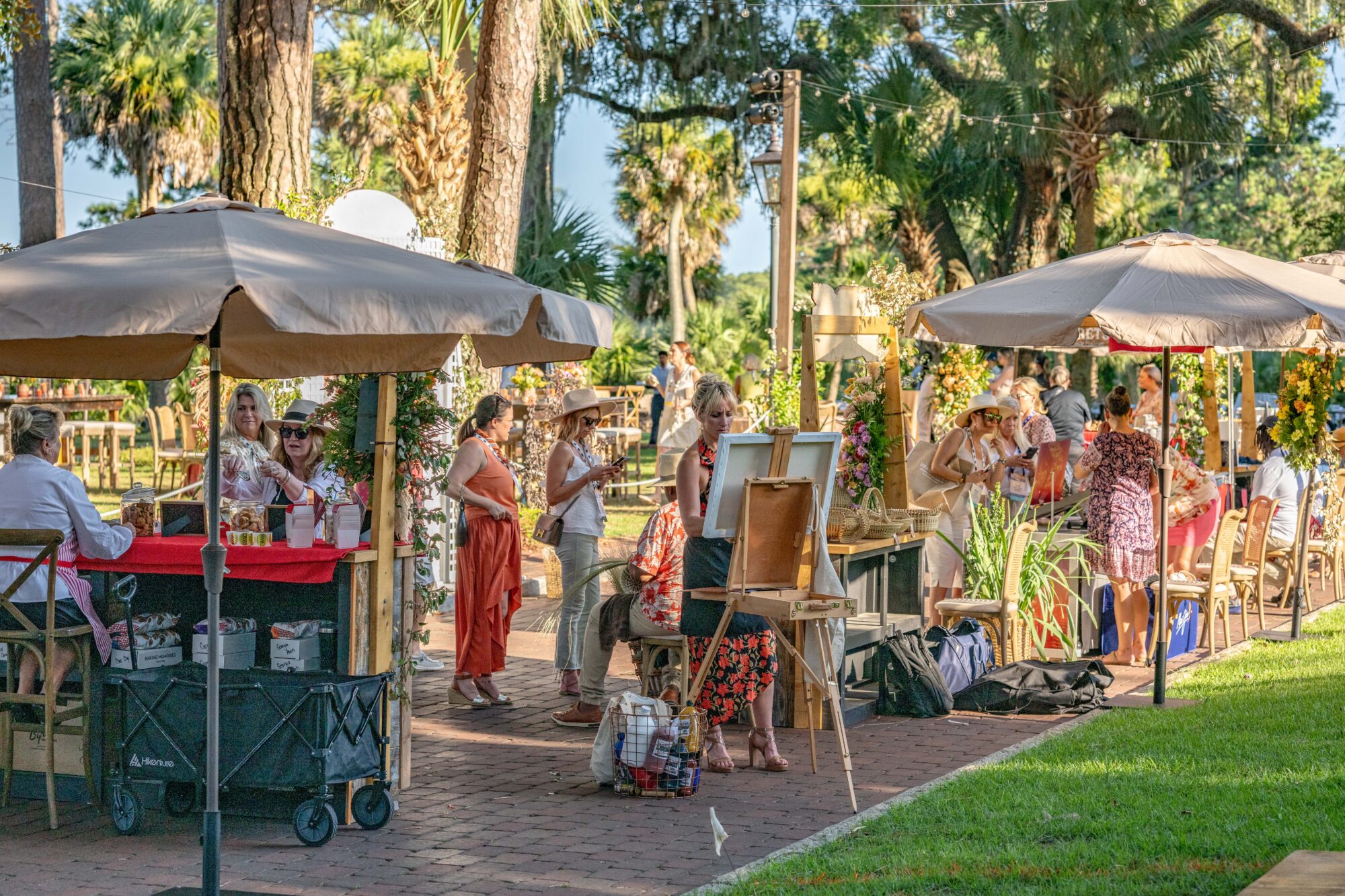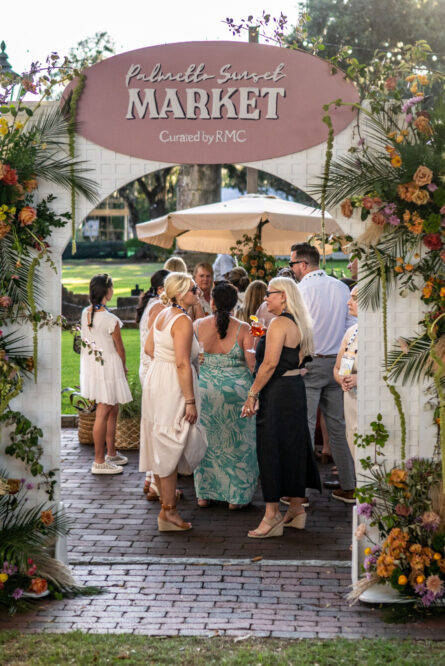 Set on the sweeping lawn of Montage Palmetto Bluff, Southern Elegance Meets Market Chic came to life through RMC’s custom-built Palmetto Sunset Market. Designed as an immersive celebration of Lowcountry craft and culture, the market invited guests to engage with local artisans through hands-on experiences—from indigo dyeing and sweetgrass basket weaving to sampling local baked goods and even meeting a baby gator. RMC-designed vendor booths and bespoke signage created a cohesive marketplace aesthetic, each framed by lush, cascading florals. Adding an element of surprise and artistry overhead, an ethereal performer—draped in flowing fabric and an ornate headdress—appeared among the Spanish moss–draped trees, transforming the landscape into a living work of art.